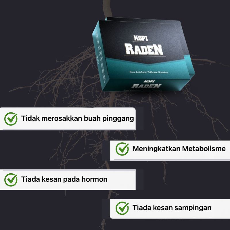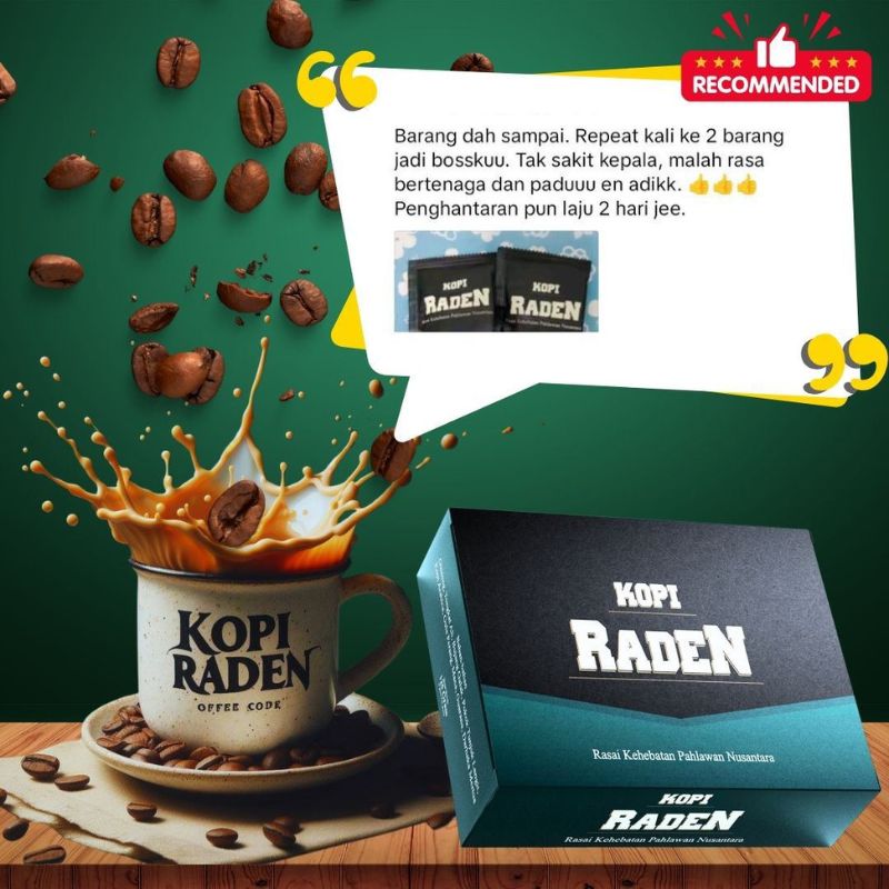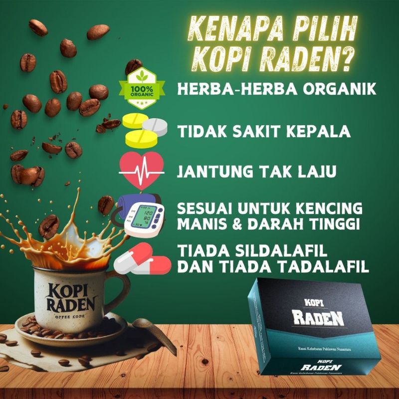 Kopi Raden ialah kopi herba lelaki yang dirumus menggunakan bahan-bahan semulajadi seperti Ginseng, Tongkat Ali dan Tunjuk Langit. Ia membantu meningkatkan tenaga, stamina dan kesihatan dalaman secara selamat.