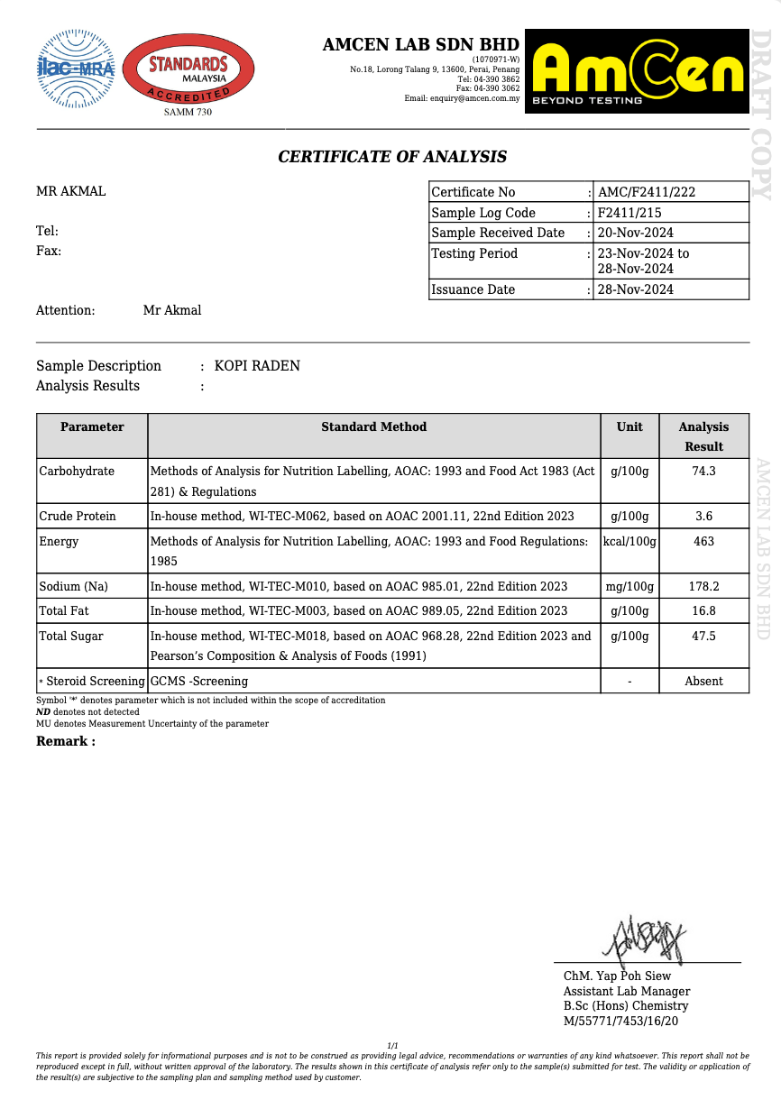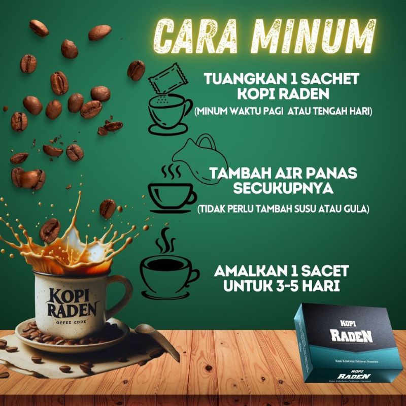 Tuangkan 1 sachet Kopi Raden ke dalam cawan, tambah air panas secukupnya, dan minum tanpa perlu menambah susu atau gula. Disyorkan minum pada waktu pagi atau tengah hari.